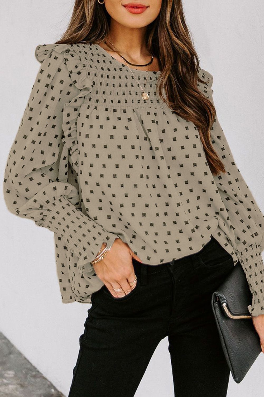 A light crepey fabrication is elevated with square pattern on this relaxed fit blouse