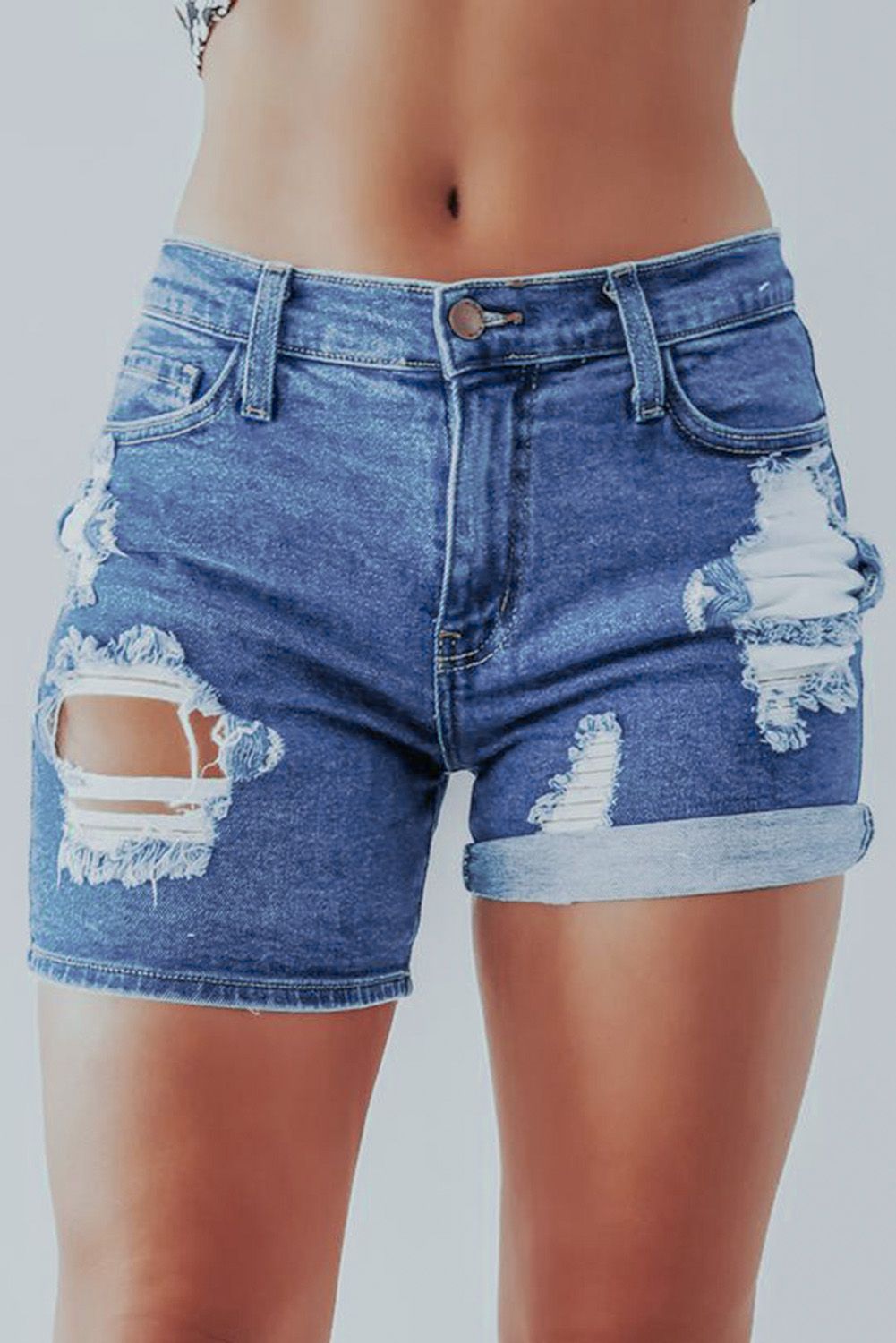 Blue Mid Waist Slim-fit Distressed Denim Shorts