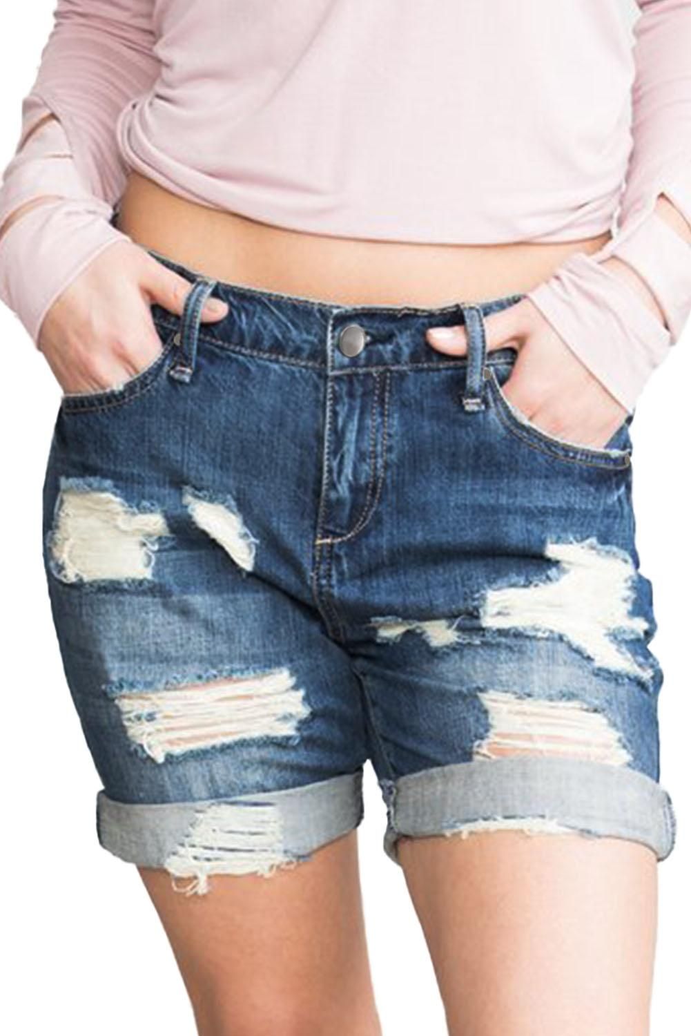 Five functional pockets Zipper and button closure Mid rise, relaxed fit, rolled cuffs Distressing detail is actual holes Denim shorts are spring transition staple womens denim shorts of the latest fashion boyfriend style