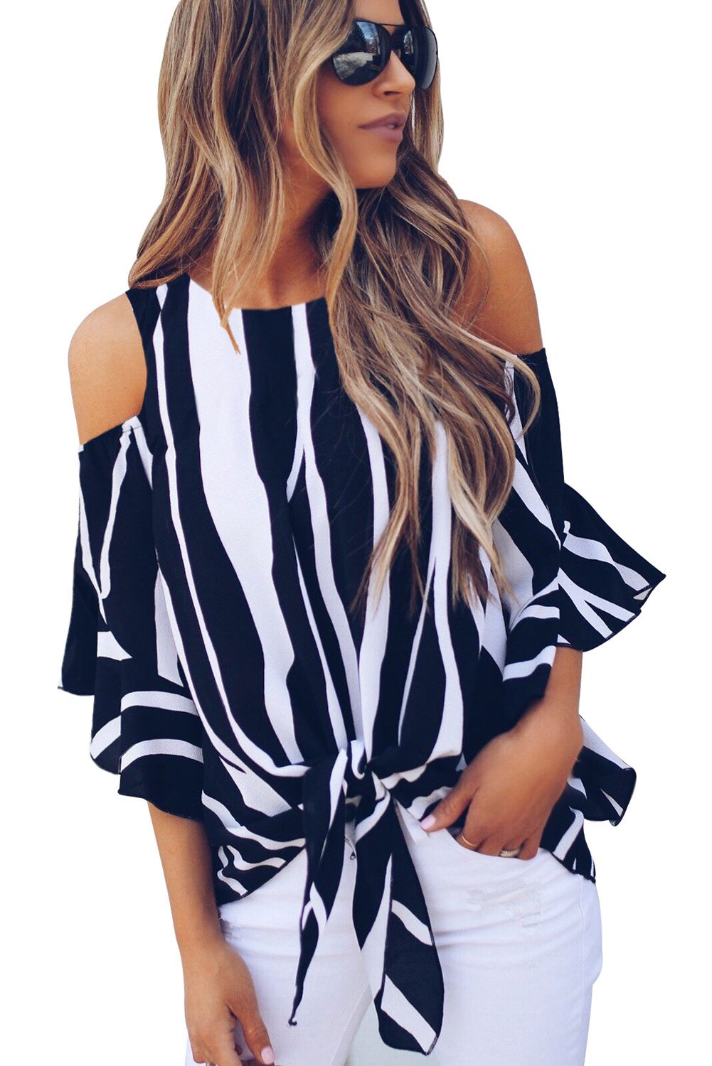 Black Cold Shoulder Vertical Stripes Blouse