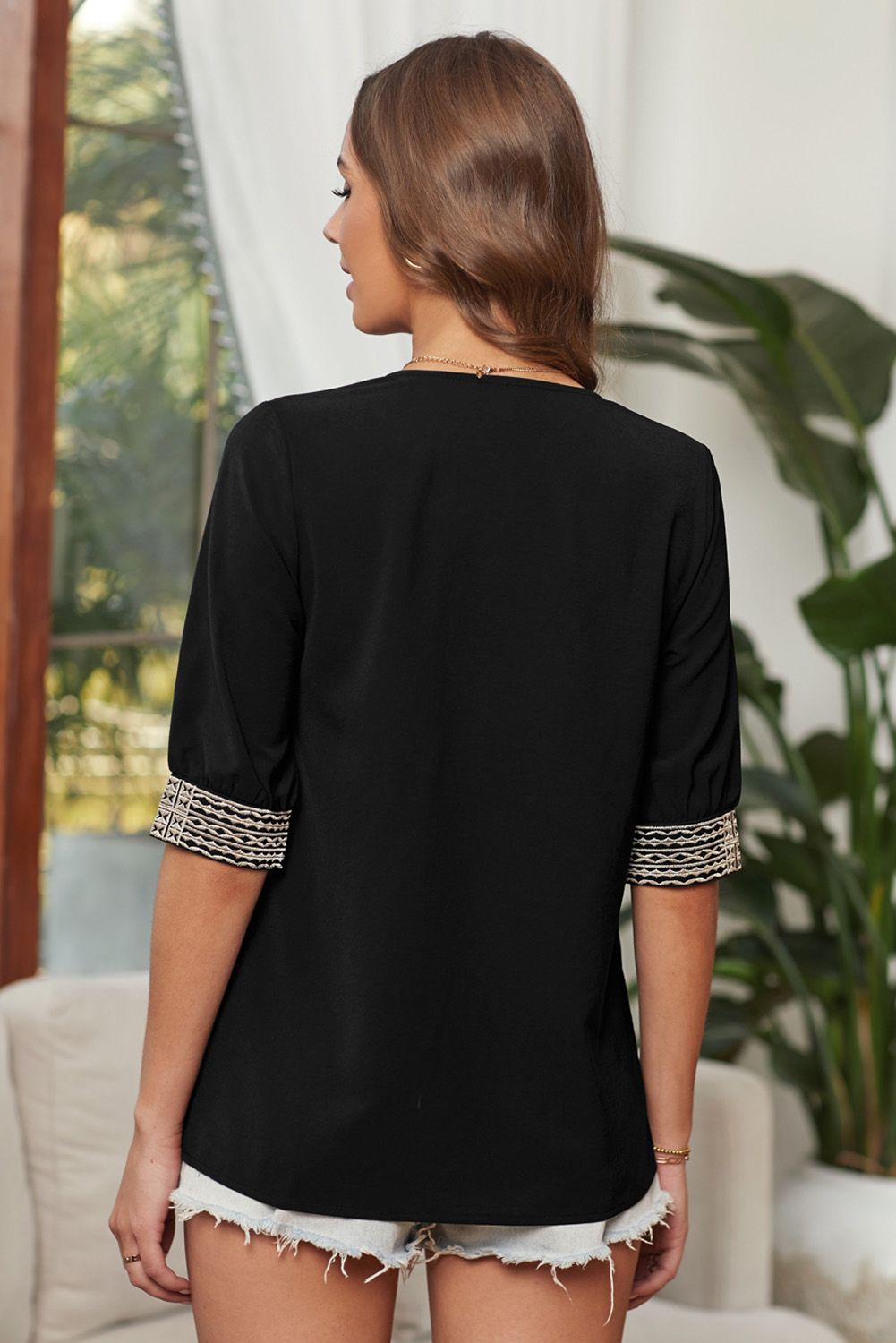 Black Deep V-neck Half Sleeve Embroidery Patch Blouse