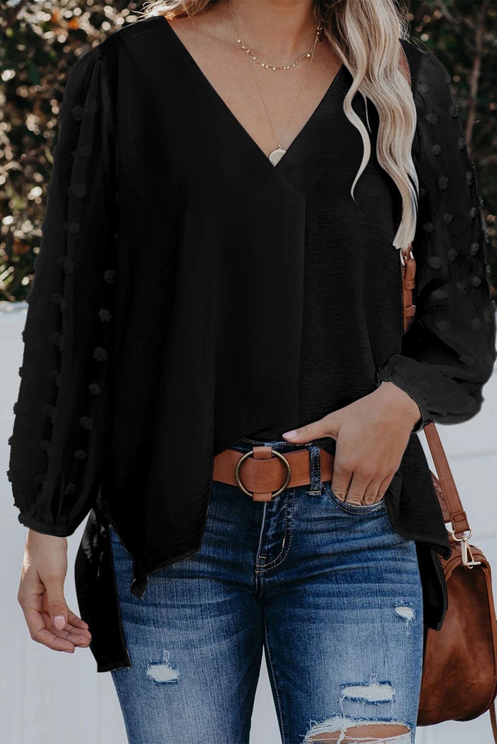 Black Swiss Dot V Neck Long Sleeve Blouse