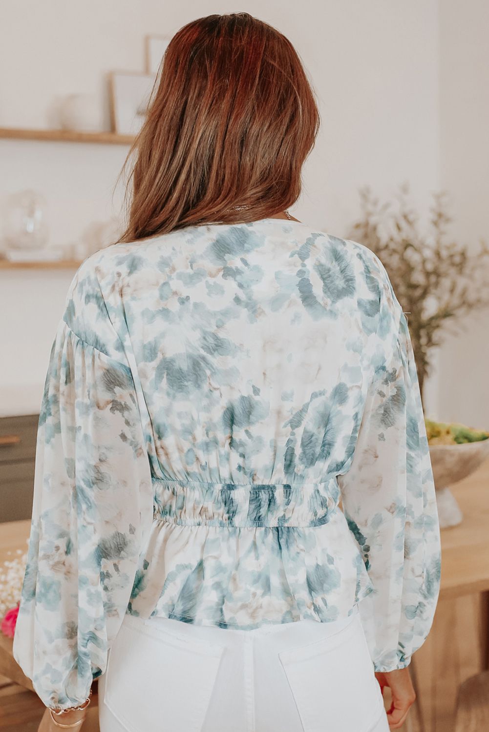 • This printed peplum top features a v-neckline, long dropped sleeves, and has a gathered waistline