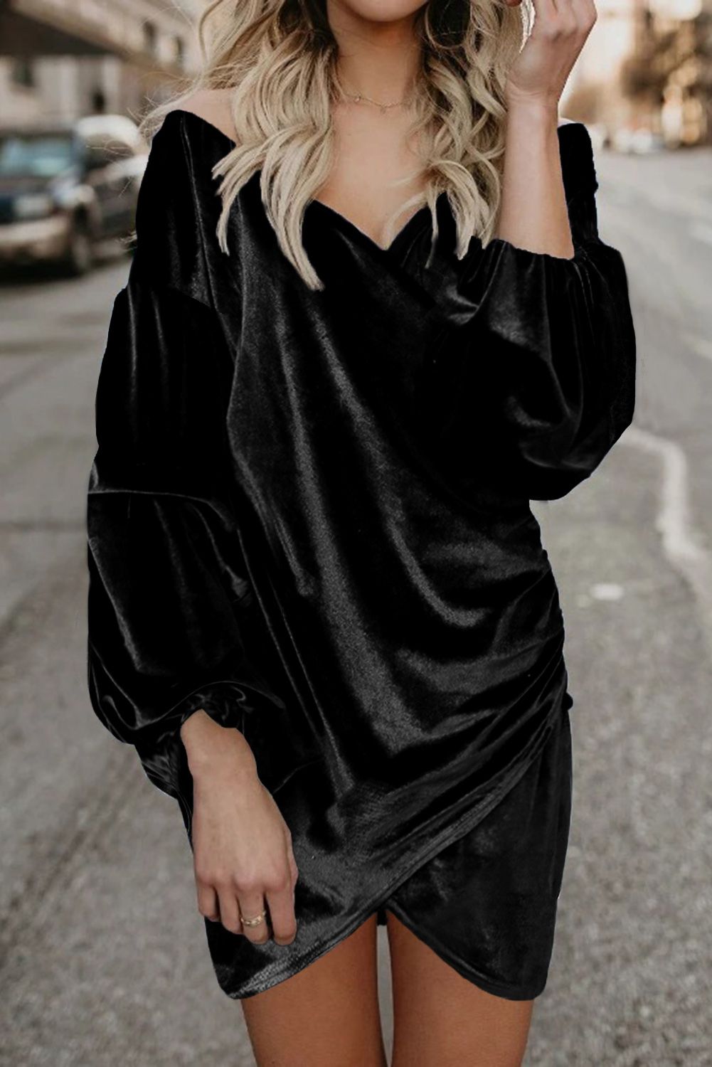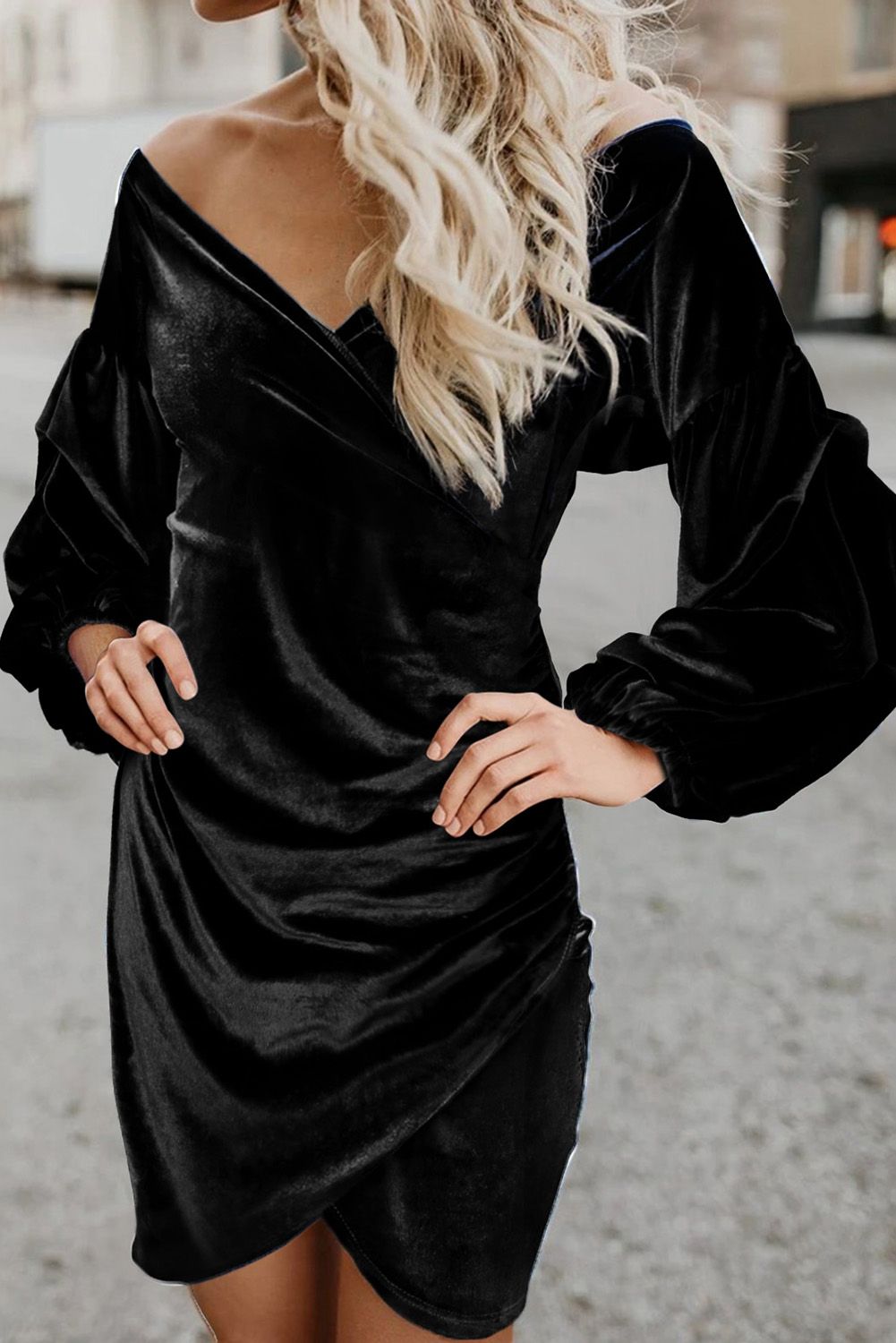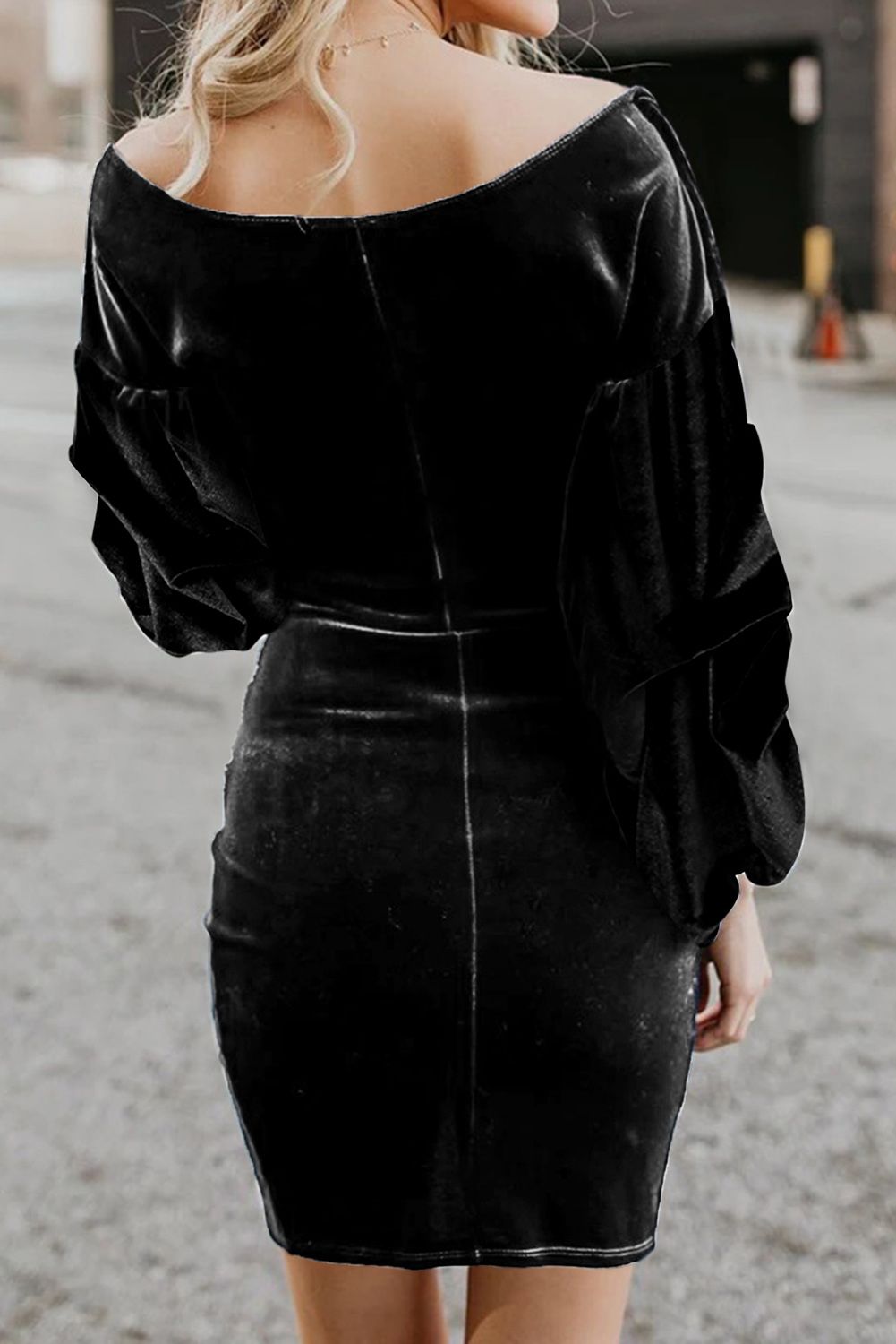 Black Puff Sleeve Off Shoulder Wrap Bodycon Velvet Dress