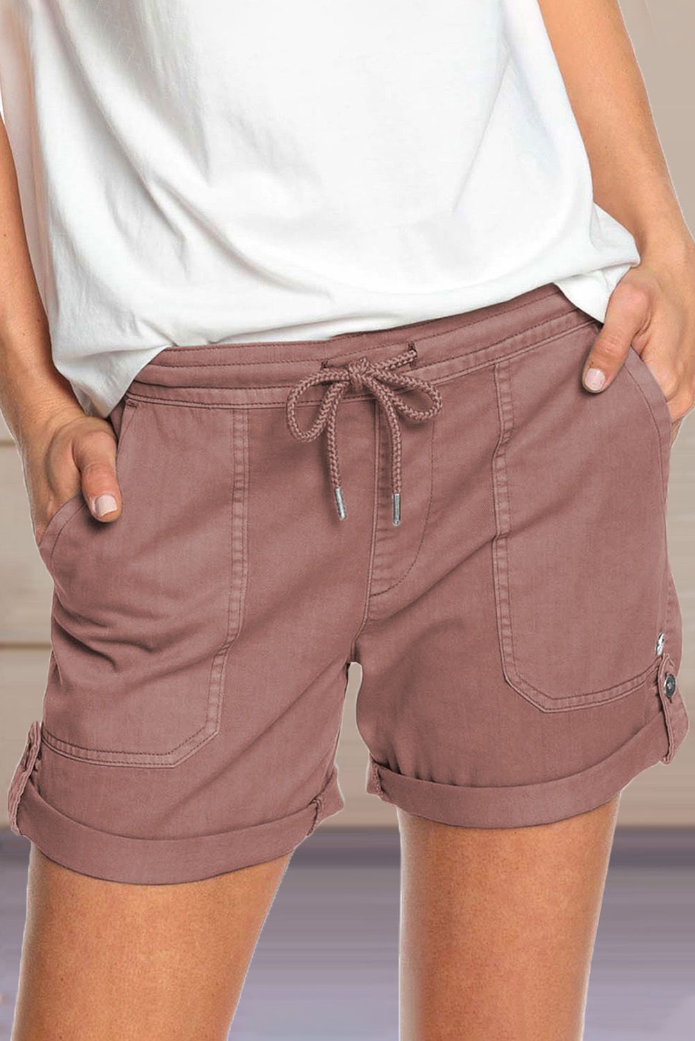 Black Elastic Waistband Pocket Drawstring Shorts with Button