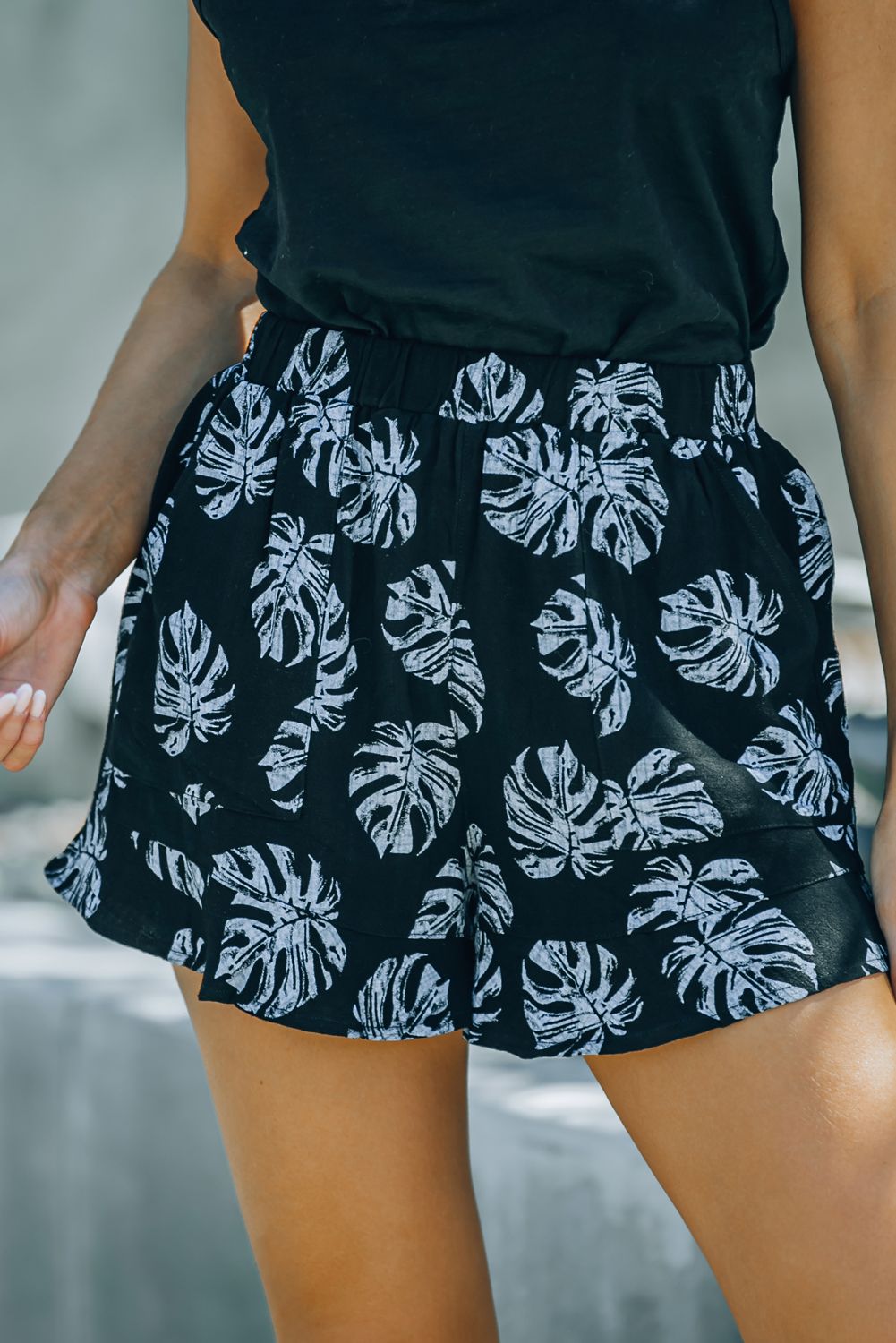 Black Palm Tree Leaves Print Elastic Waist Shorts with Pocket