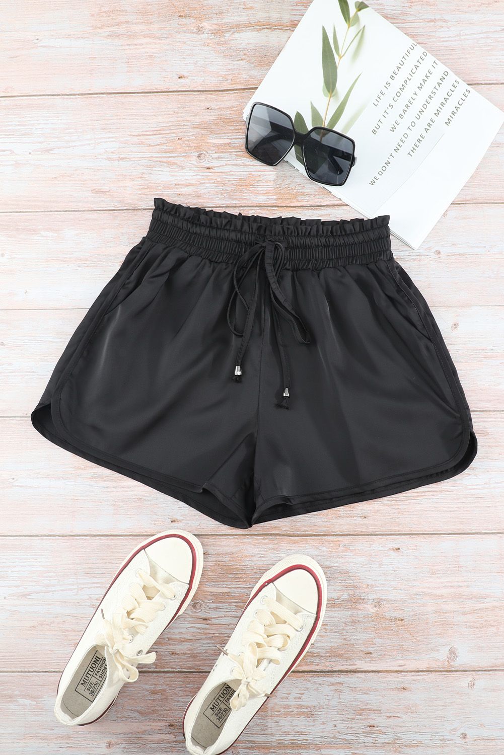Black Satin Elastic Waist Casual Shorts