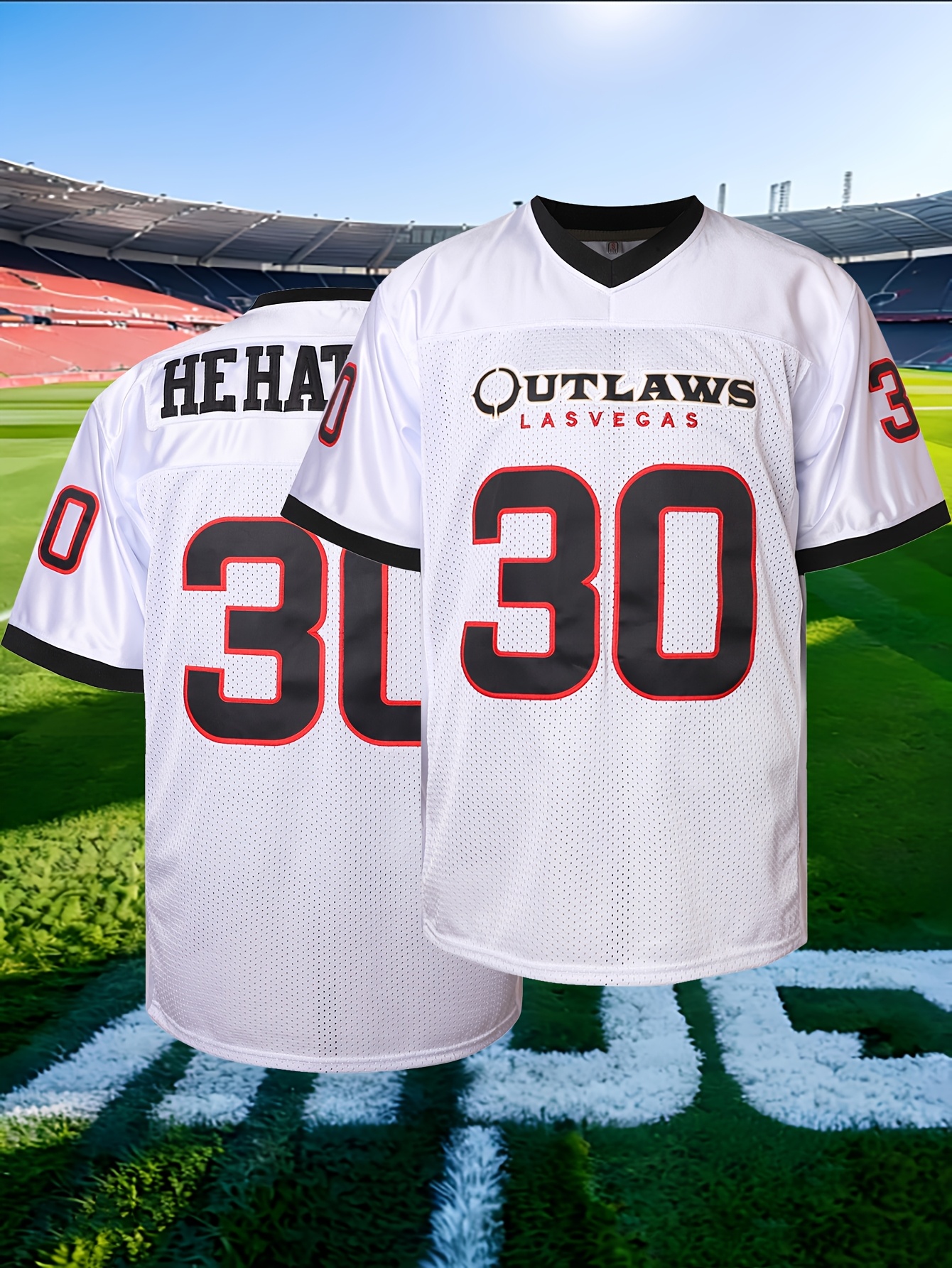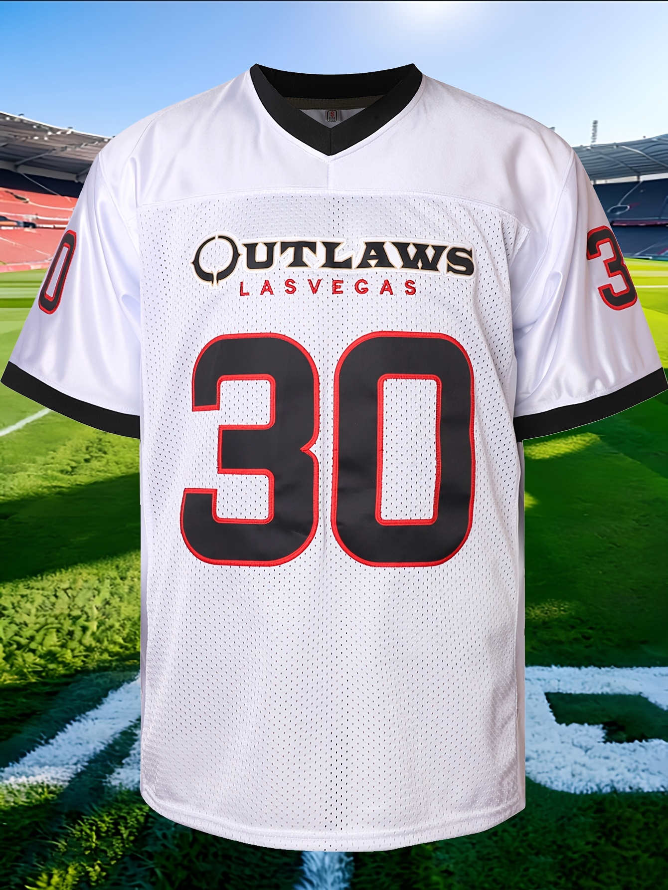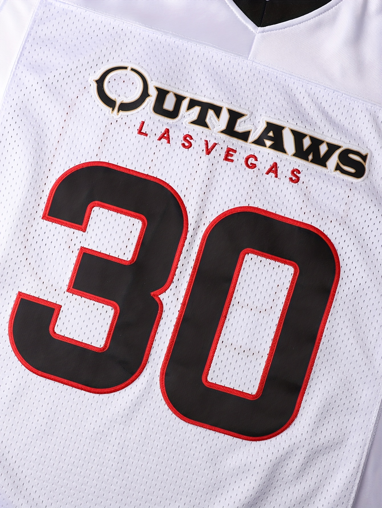 Men's #30 White American Football Jersey - V-Neck, "Outlaws" Design, Breathable Polyester, Casual & Sporty Fit for Parties, Training & Casual Attire, Outdoor Activewear | Sporty Vneck | Glossy Finish