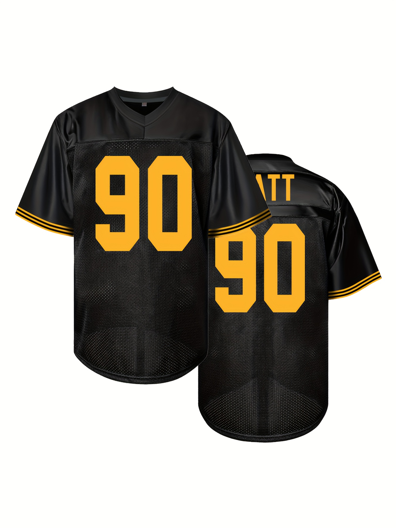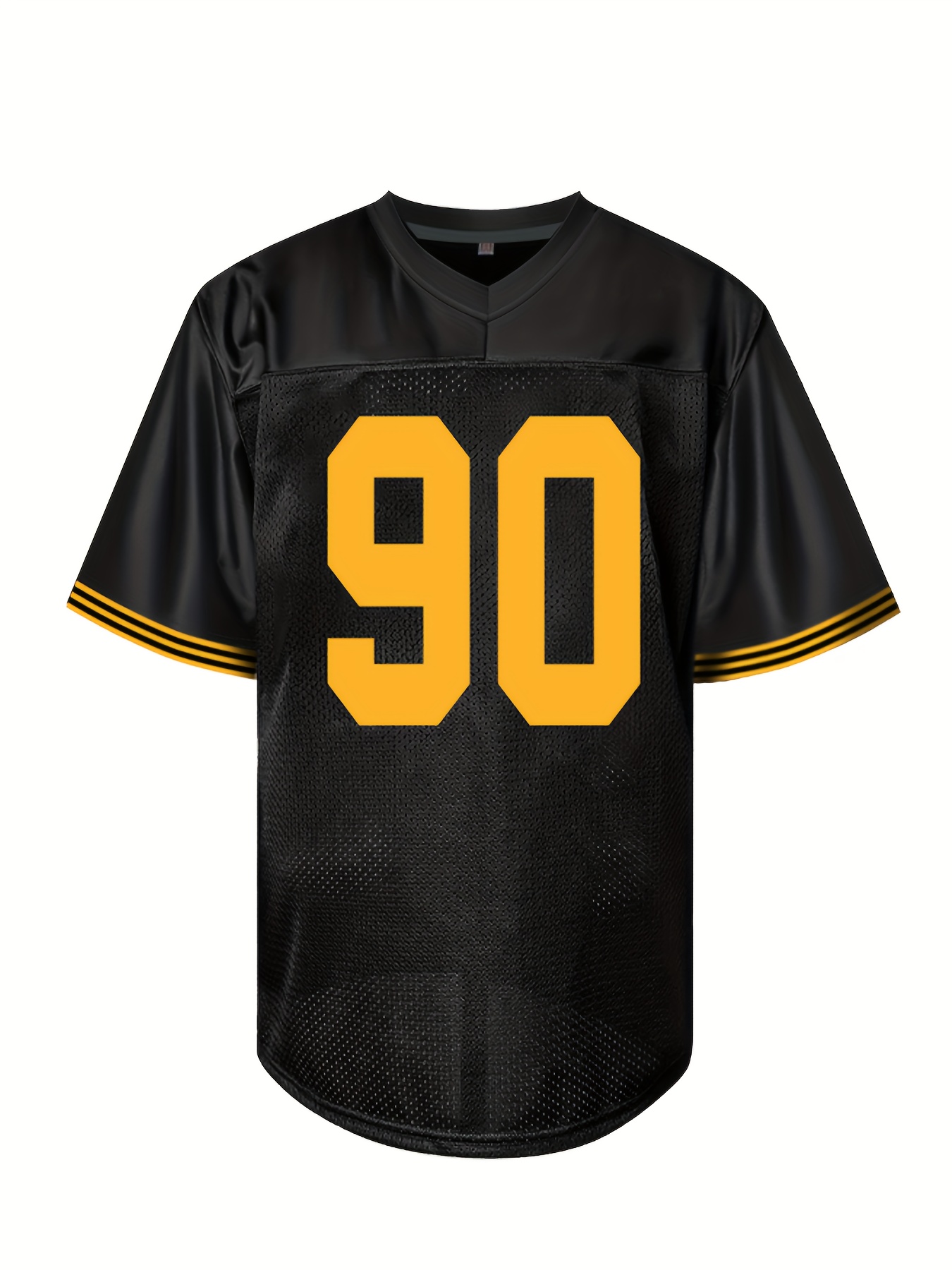 Men's Black #90 Breathable Polyester Rugby Shirt - V-Neck Embroidered American Football Jersey, Loose Fit All-Season Training Top for Hiking, Outdoor & Casual Wear, Embroidered Detailing