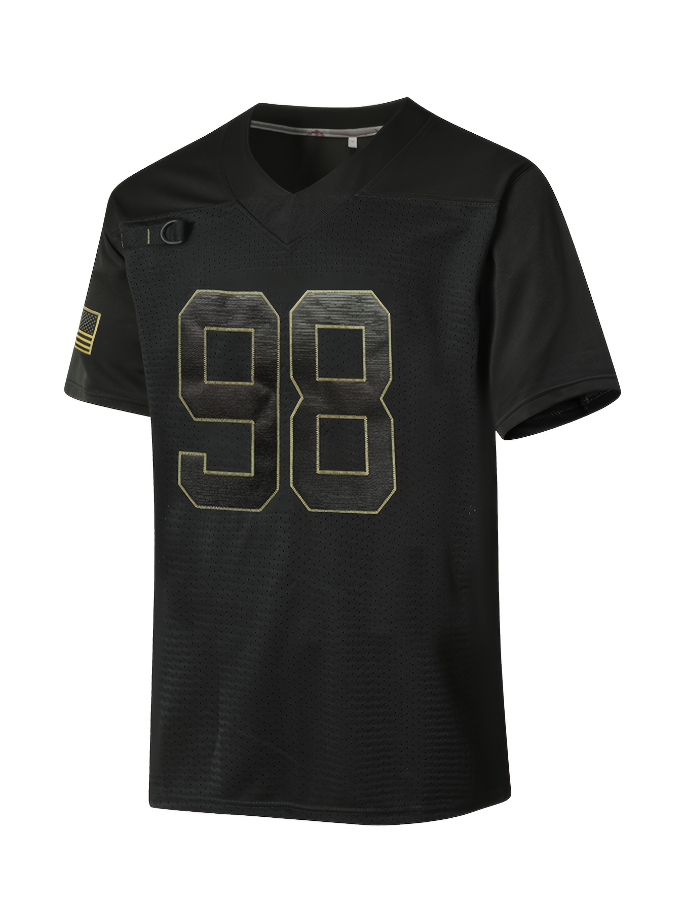 Men's Black #98 Breathable Rugby Jersey - V-Neck Short Sleeve, Classic Embroidered American Football Shirt with Distressed Golden Lettering, Loose Fit for Training, Outdoor Activities & Casual Wear, Durable Sportswear, Athletic Fabric