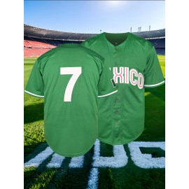 Men's V-Neck Baseball Jersey with Embroidered Green "7" Number, White Striped Sleeves, Polyester Knit Fabric, Button Closure - Perfect for Casual Training, Team Sports & Parties, Best for Christmas
