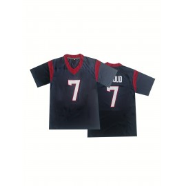 Men'S Blue #7 Rugby Shirt, Breathable V-Neck Short Sleeve Training Top, Classic Embroidered American Football Jersey, Polyester Knit, Sports Casual, Running, Training, Hiking, Outdoor, Party, Loose Fit, Adult & Youth Unisex